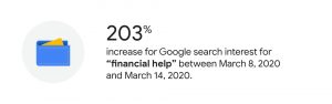 As the impact of the COVID-19 pandemic continues to unfold across the globe, it’s affecting different people and communities in different ways. But one commonality is that, in addition to concerns about their own health and the health of family, friends and loved ones, people are concerned about their financial well-being. These concerns include how to meet day-to-day obligations like rent or groceries — and extend to issues such as how best to pay taxes, how to access cash for essential items, how to make digital payments, how to get money to loved ones, and how to manage investments. From March 8, 2020, to March 14, 2020, search behavior on Google for “financial help” grew 203% over one week.